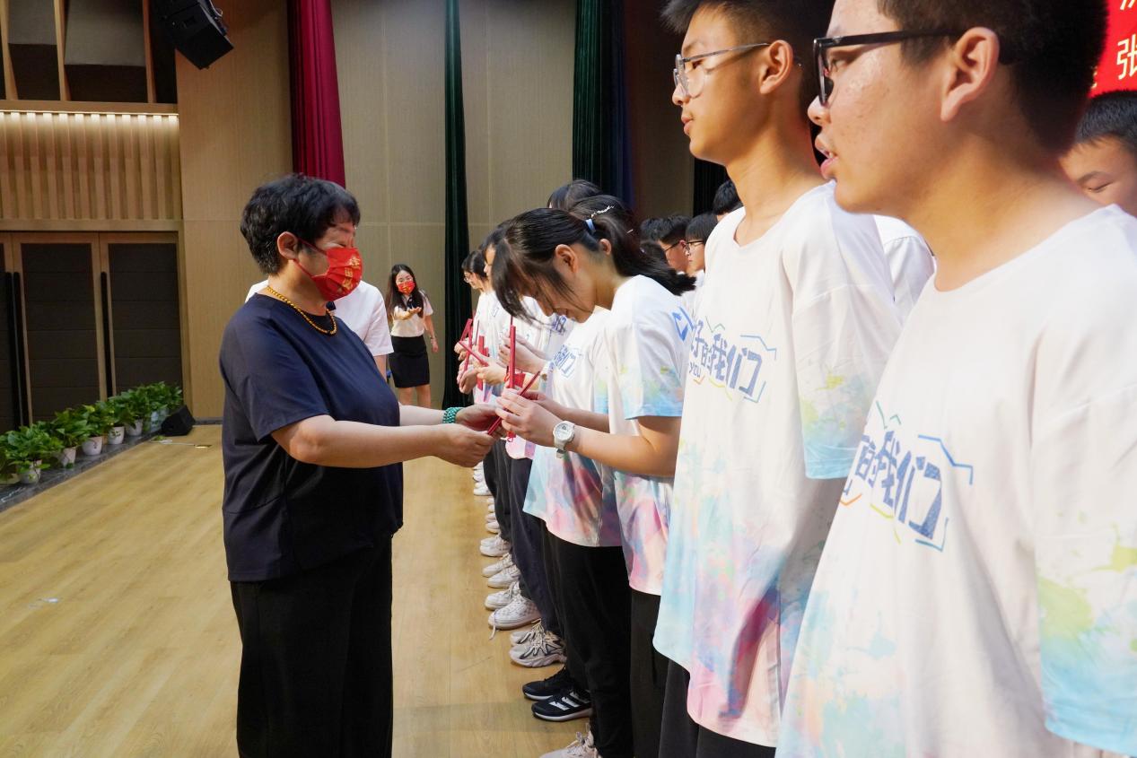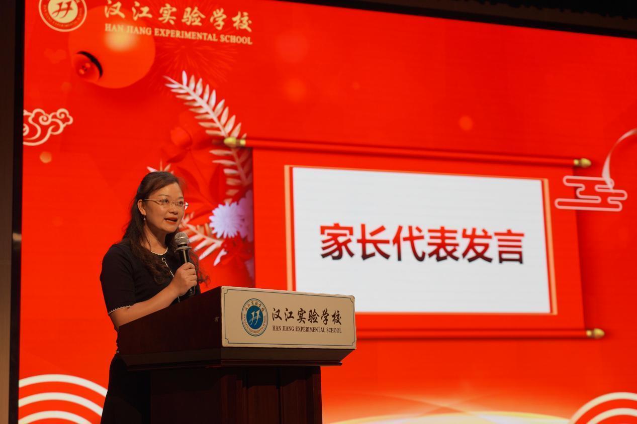 家长代表九(3)班陈淑媛妈妈发言,祝福孩子们学业有成,金榜题名。同时,感激学校的精心培育,感谢老师的辛勤付出,希望孩子们能够不断地充实自己、完善自己,找准自己的人生轨道,用智慧和勤奋创造出辉煌的人生价值。
