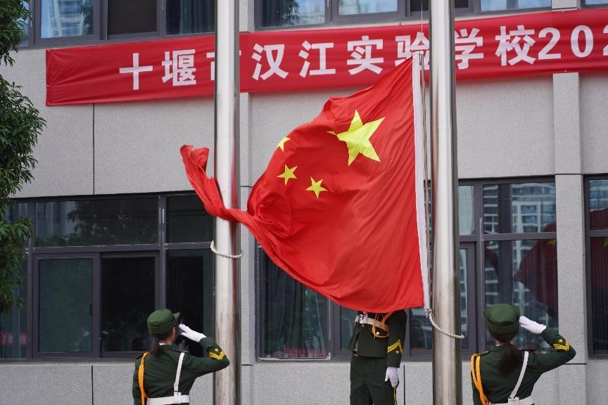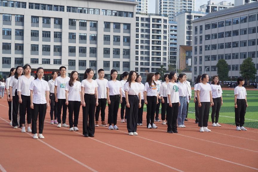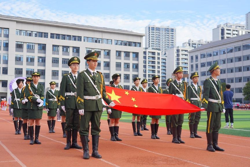 所有队伍集结完毕,举行升旗仪式。随着庄严雄壮的国歌响起,全体师生肃立,注视着鲜艳的五星红旗冉冉升起!