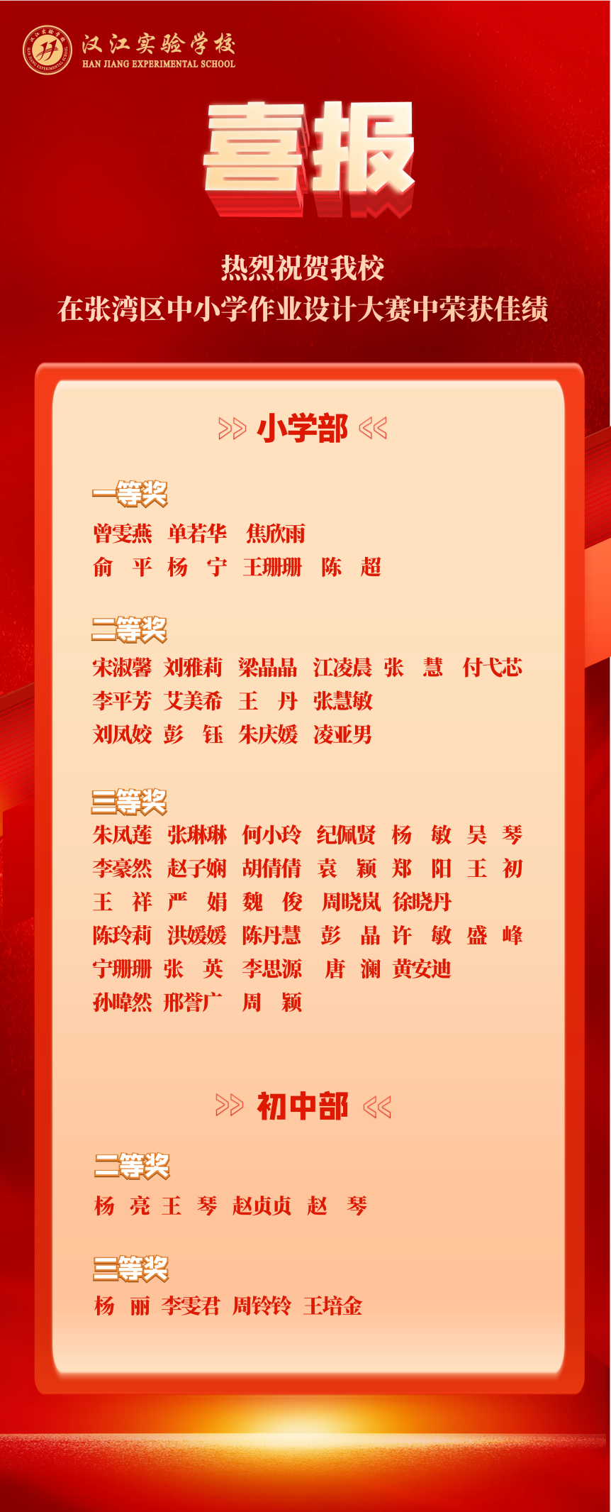 为贯彻落实“双减”政策,严格执行教育部“五项管理”中的作业管理要求,促进教师加强作业设计的实效性,切实减轻学生作业负担,张湾区教育教学服务中心组织了中小学教师作业设计大赛。汉江实验学校教师积极参与,斩获佳绩,在全区1293名参赛教师中脱颖而出,获得7个一等奖,18个二等奖,35个三等奖。