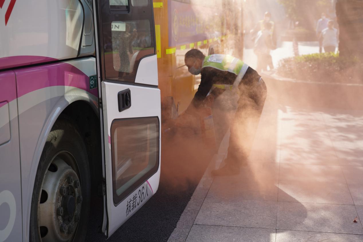演练开始,校车驾驶员发现车辆追尾后,将车辆紧急停靠至安全区域,并及时灭火。学生在跟车教师的组织下,按序依次下车,迅速撤离到指定安全地点。老师检查车内有无滞留学生,及时稳定现场学生情绪,清点人数后迅速报警,并立即向学校报告情况。整个过程紧张、有序,演练顺利完成。