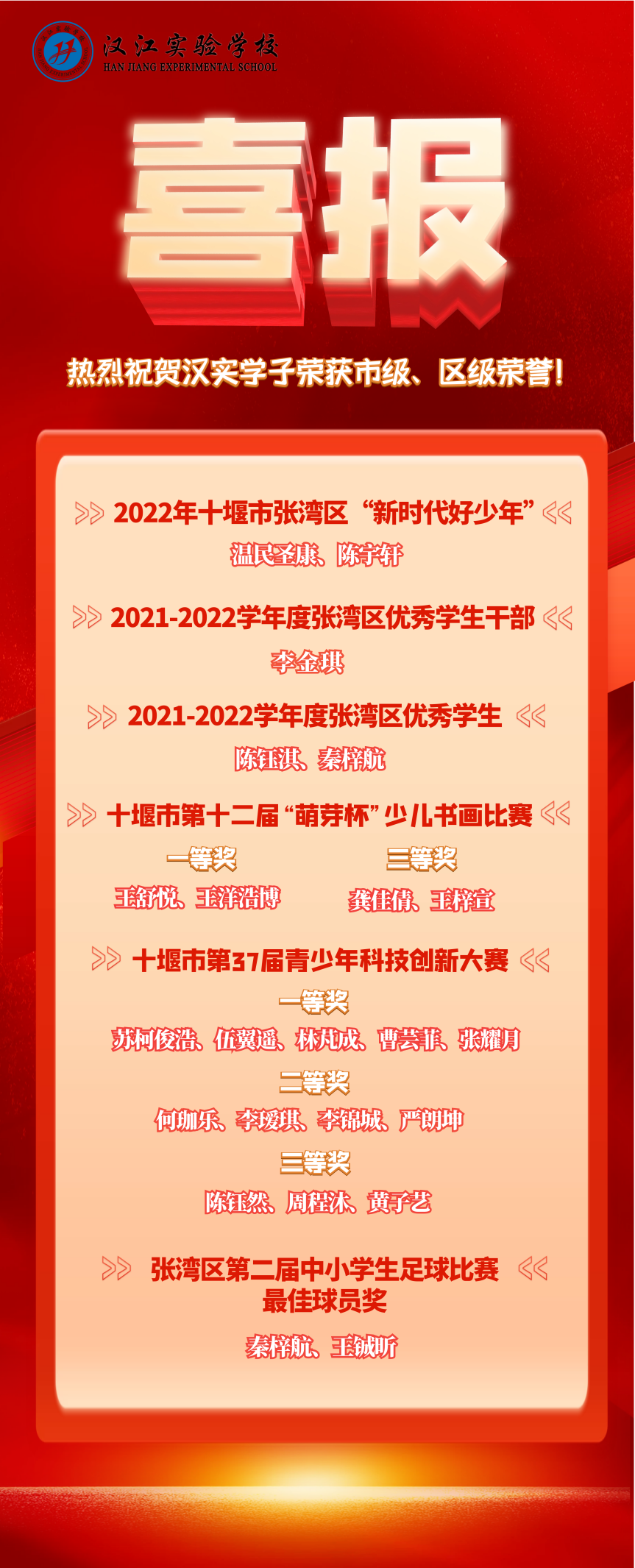 此外,我校学生还积极参与各类赛事活动,斩获骄人成绩。在十堰市第十二届“萌芽杯”少儿书画比赛中,我校学生王舒悦、王洋浩博荣获一等奖,龚佳倩、王梓宣荣获三等奖。在十堰市第37届青少年科技创新大赛中,我校学生苏柯俊浩、伍翼遥、林芃成、曹芸菲、张耀月荣获一等奖,何珈乐、李瑷琪、李锦城、严朗坤荣获二等奖,陈钰然、周程沐、黄子艺荣获三等奖。在张湾区第二届中小学生足球比赛中,我校学生秦梓航、王铖昕荣获最佳球员奖。追逐榜样之光,汲取榜样力量,全体汉实学子将以他们为前进的方向,点燃学习热情,在新学期努力取得更优成绩。