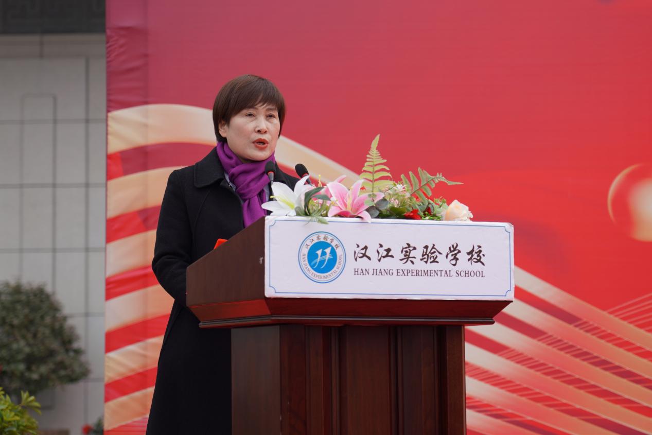 优秀教师代表俞平回顾了和汉实学子携手并进的校园时光,展望了令人期待的新学期学习生活。她希望同学们坚持奋斗、克服困难,珍惜时光、好好学习,懂得尊重、感恩前行,将言语化为行动,新学期再创辉煌。