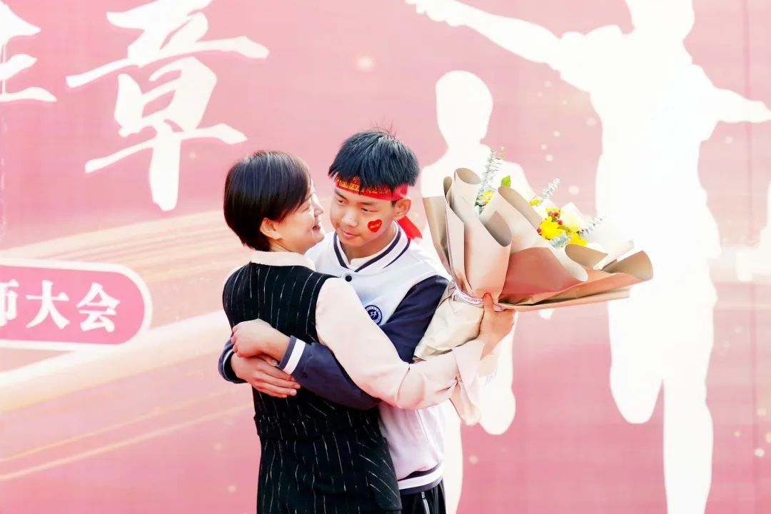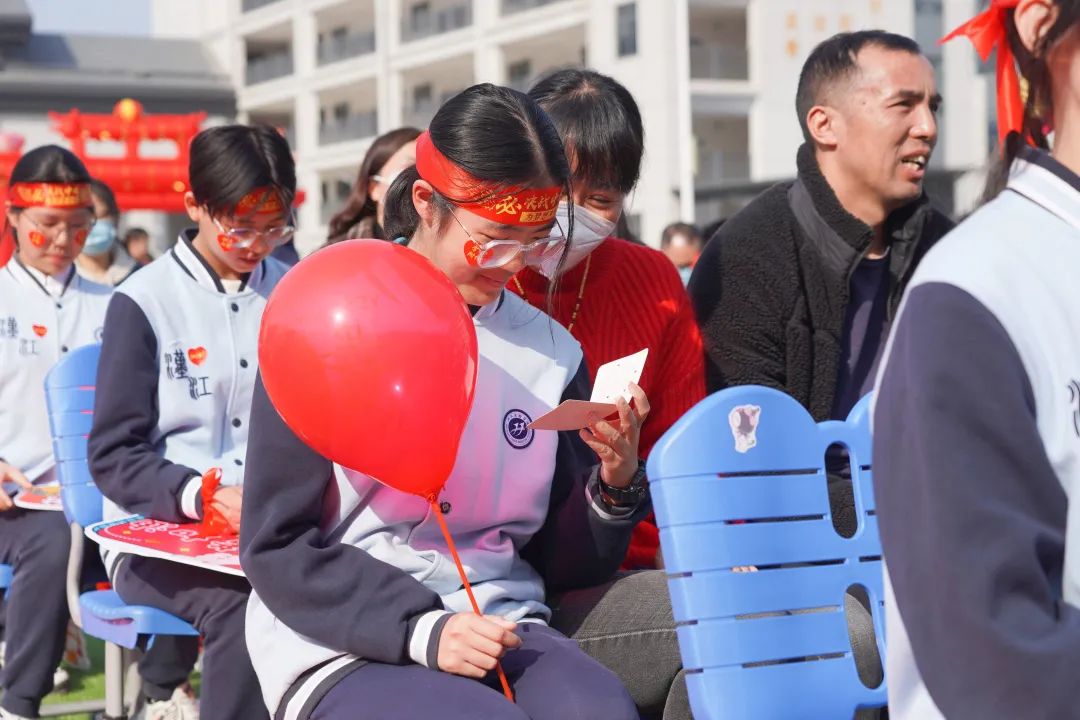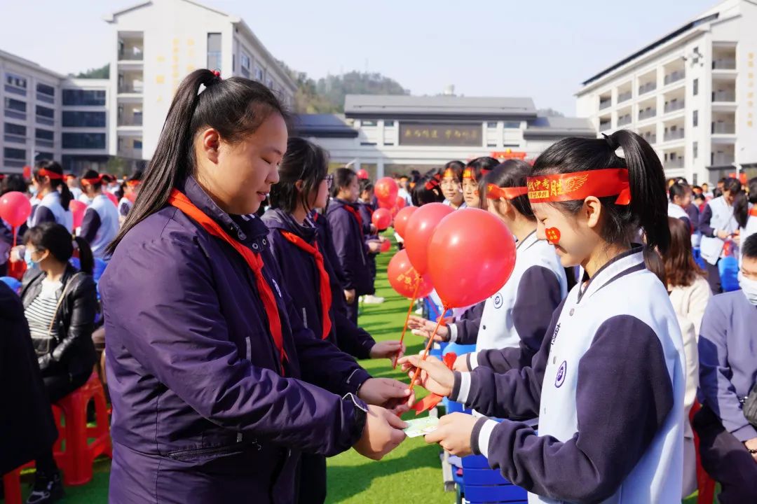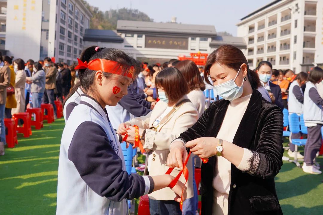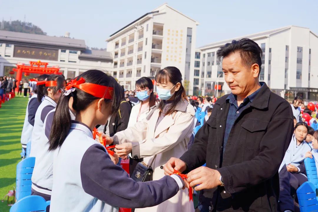 全体九年级家长们亲临现场,为孩子们戴上象征胜利的丝带,激励全体学子坚定理想、乘风破浪、驶向成功的彼岸。