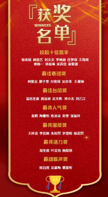 两个小时的精彩角逐悄然落幕,最终由教师评委、家长代表评委及学生代表评委共同评选出校园十佳歌手、最佳台风奖、最具潜质奖、最佳表现奖、最具人气奖、最甜歌声奖、最具活力奖等七个奖项。小歌手们个个表现优秀,实至名归,当之不愧!