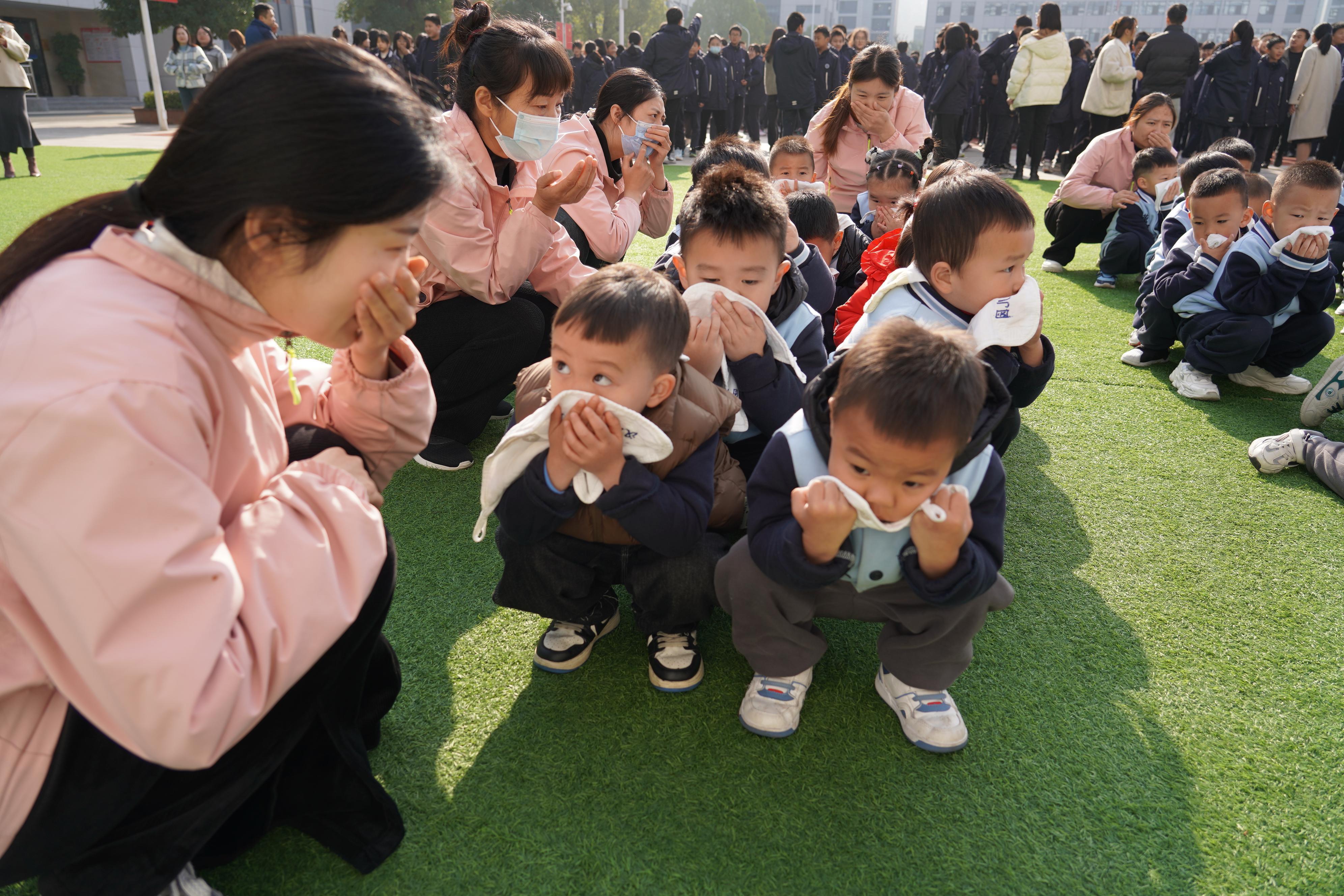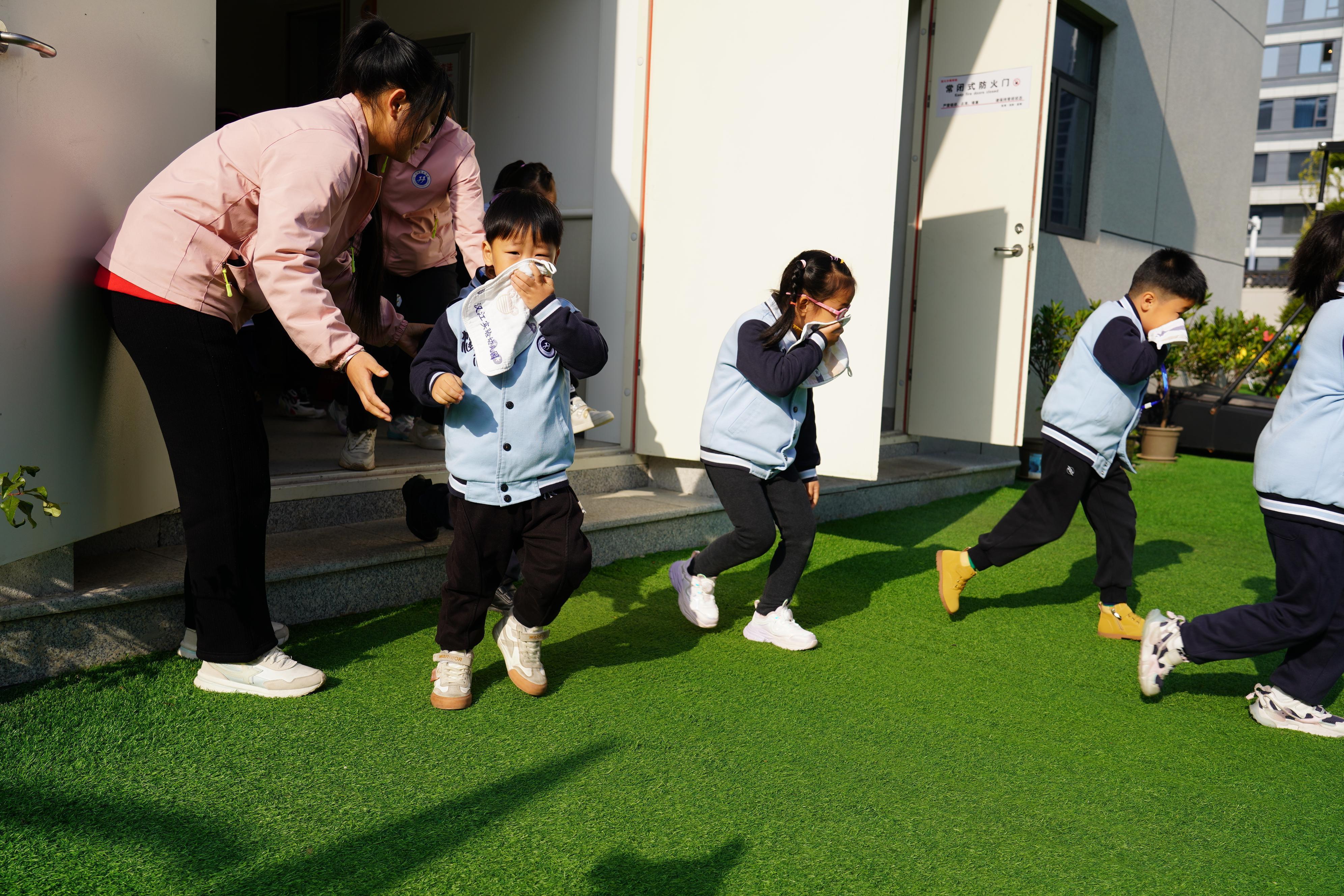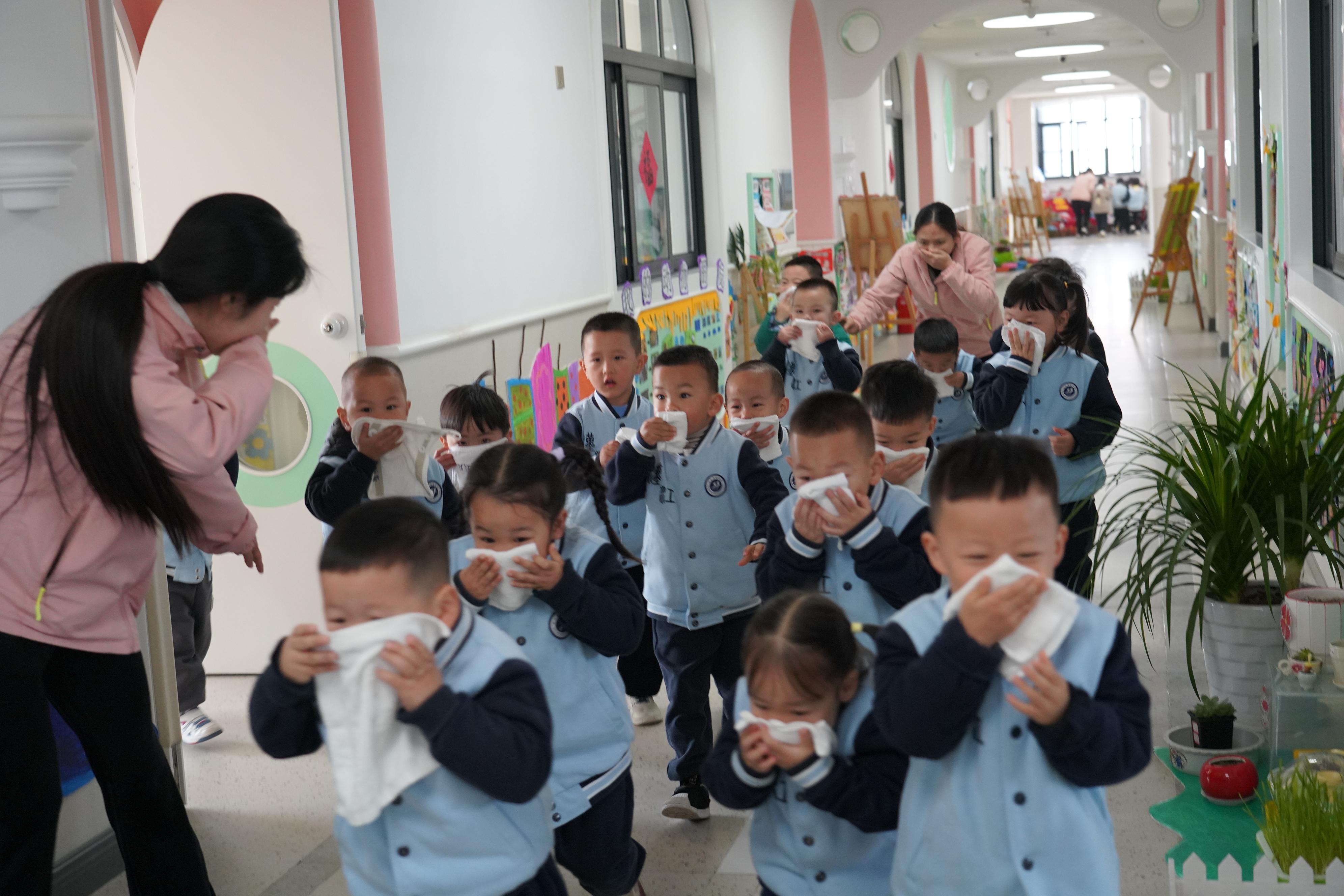 警报声响起后,全体师生捂住口鼻、低头弯腰,快速有序地按规划路线从逃生出口疏散到操场安全地带。全体师生撤离到安全地带后,各班及时清点上报学生人数。