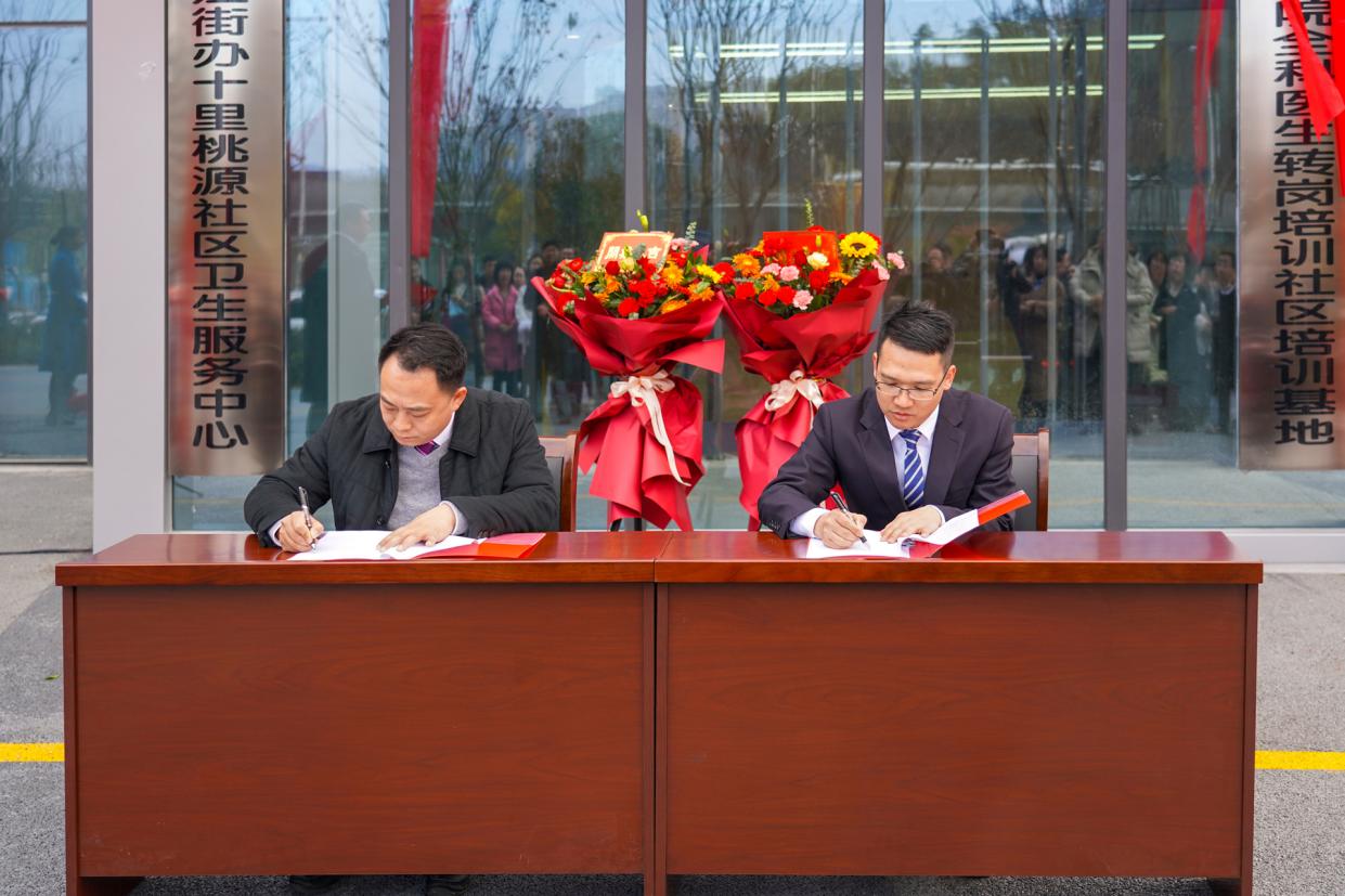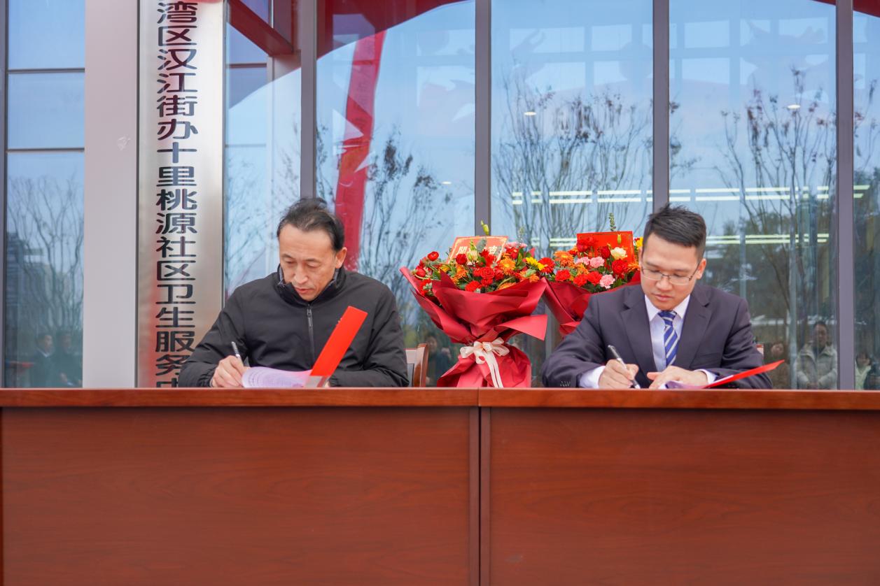 十里桃源社区卫生服务中心、社区医院负责人曾俊分别与汉江实验学校、市奥体中心、浙江大家物业服务集团有限公司湖北分公司、市城控步道建设开发有限公司、汉江街办熊家湾村卫生服务站等合作伙伴进行了合作签约。