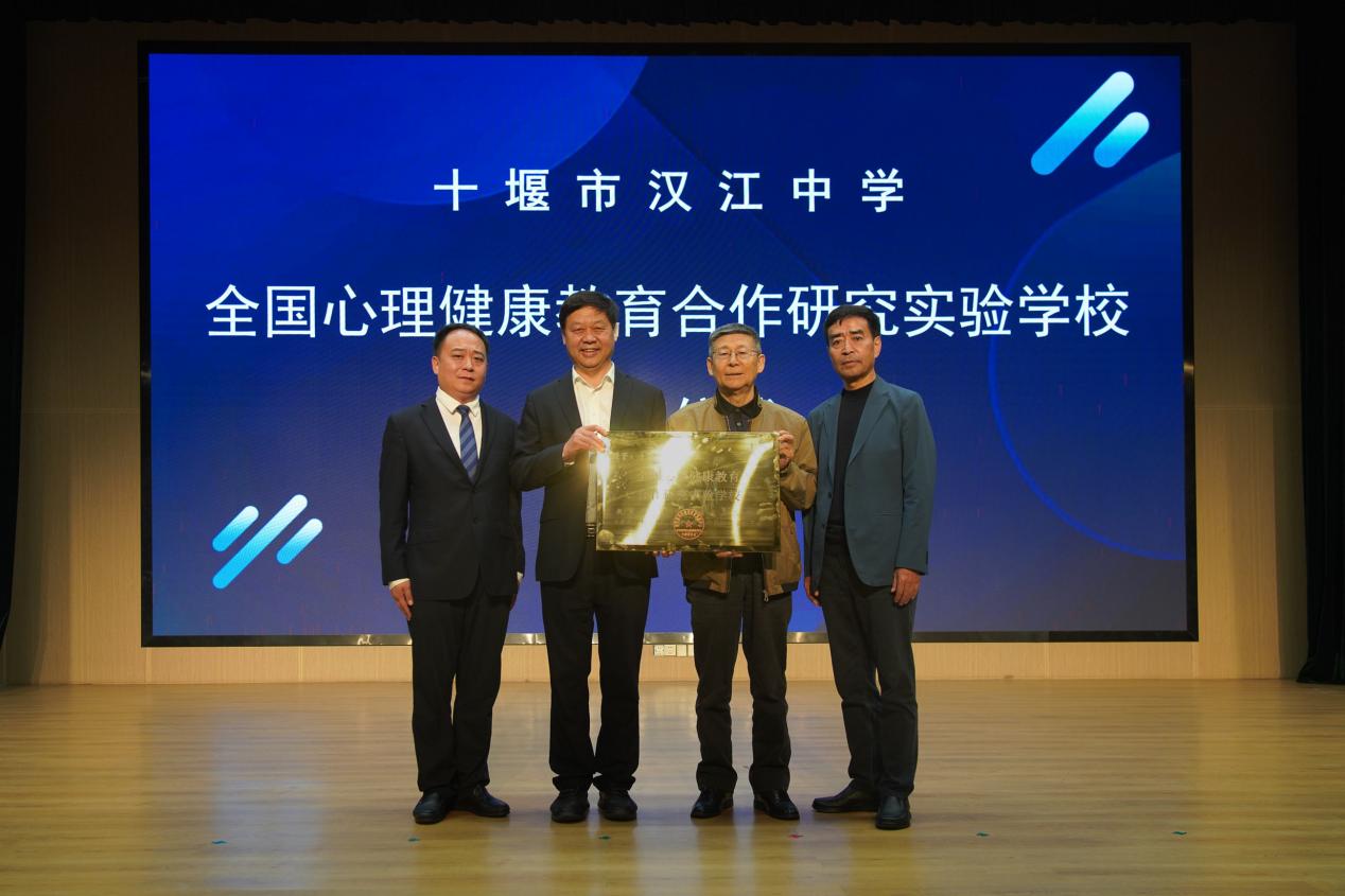 会议结束后,郑日昌教授向学校颁发教育部规划发展中心《全国心理健康教育合作研究实验学?!坟遗?,汉江实验学校党支部书记陈伟、总校长朱仕竹,汉江中学校长马新民代表学校接受授牌。
