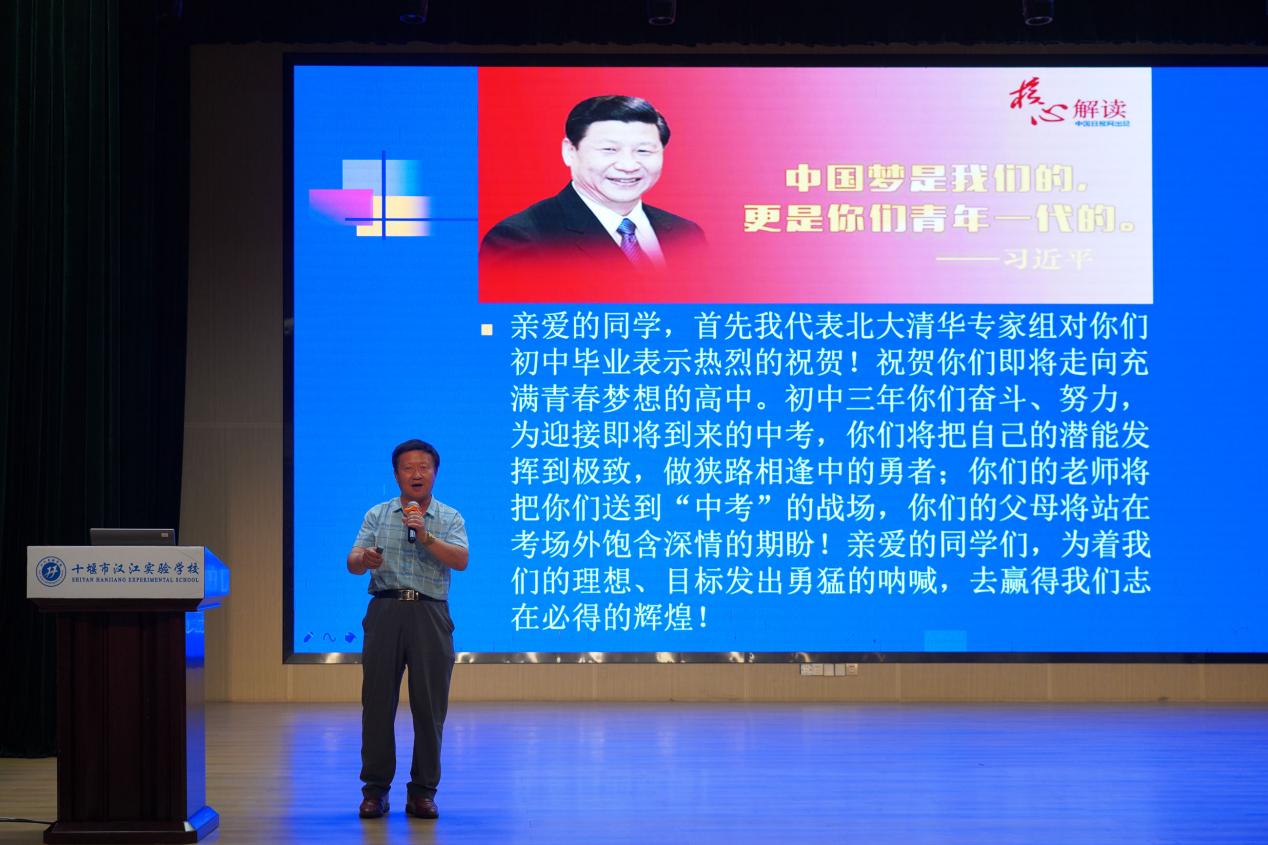 清华大学余京智教授和北京大学李亚平教授发表了热情洋溢的讲话,他们表示汉江中学将肩负教育使命,追求卓越,用最优质的教育,办一流学校。李教授给予九年级学子应试技巧的指导,并向学生代表赠书,希望全体学子以稳定的心态迎接中考,并从汉江中学再次起航,走向一流的大学。
