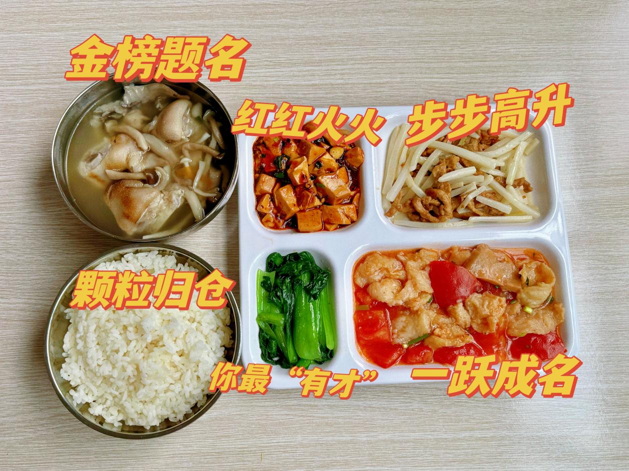 “食”力助考 ,“味”你加油!学校精心制定食谱,将食材、菜谱及其寓意巧妙结合,送上“花式”祝福,“红红火火”“步步高升”“颗粒归仓”“一跃成名”等菜谱,助力中考,再加马力。