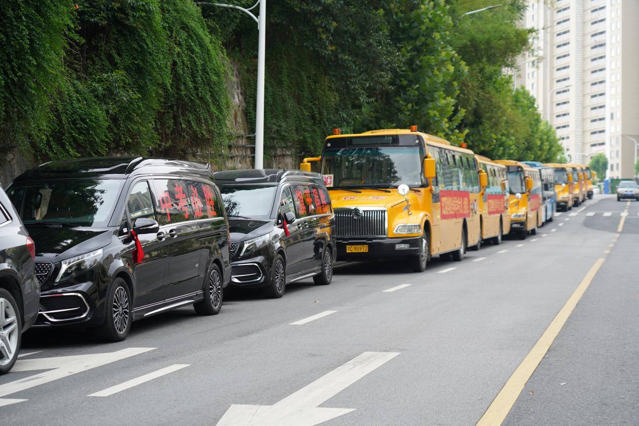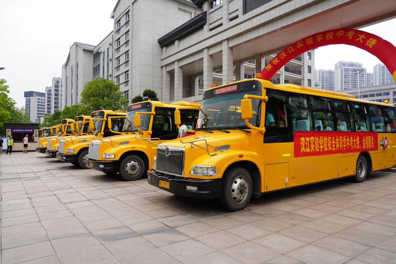 送考领导和老师们身穿红色祝愿服,九辆校车送考成为一道亮丽的风景线,同时寓意着我校九年级学子在本次考试中红红火火、鸿运当头。