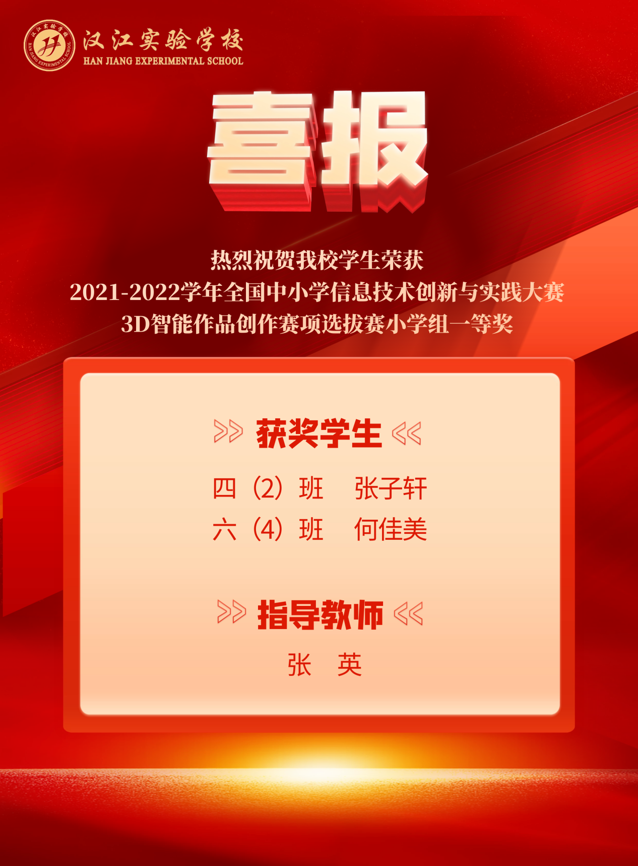 近期,由城乡统筹发展研究中心和中国人工智能学会共同主办的2021-2022学年“全国中小学信息技术创新与实践大赛”初赛结果已公布。汉江实验学校张子轩、何佳美两位同学共同合作完成的作品《多功能无人驾驶垃圾车》荣获大赛3D智能作品创作赛项选拔赛的小学组一等奖,顺利入围全国选拔赛。
