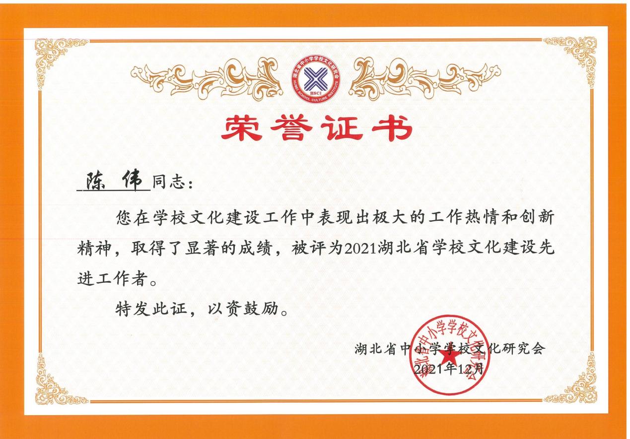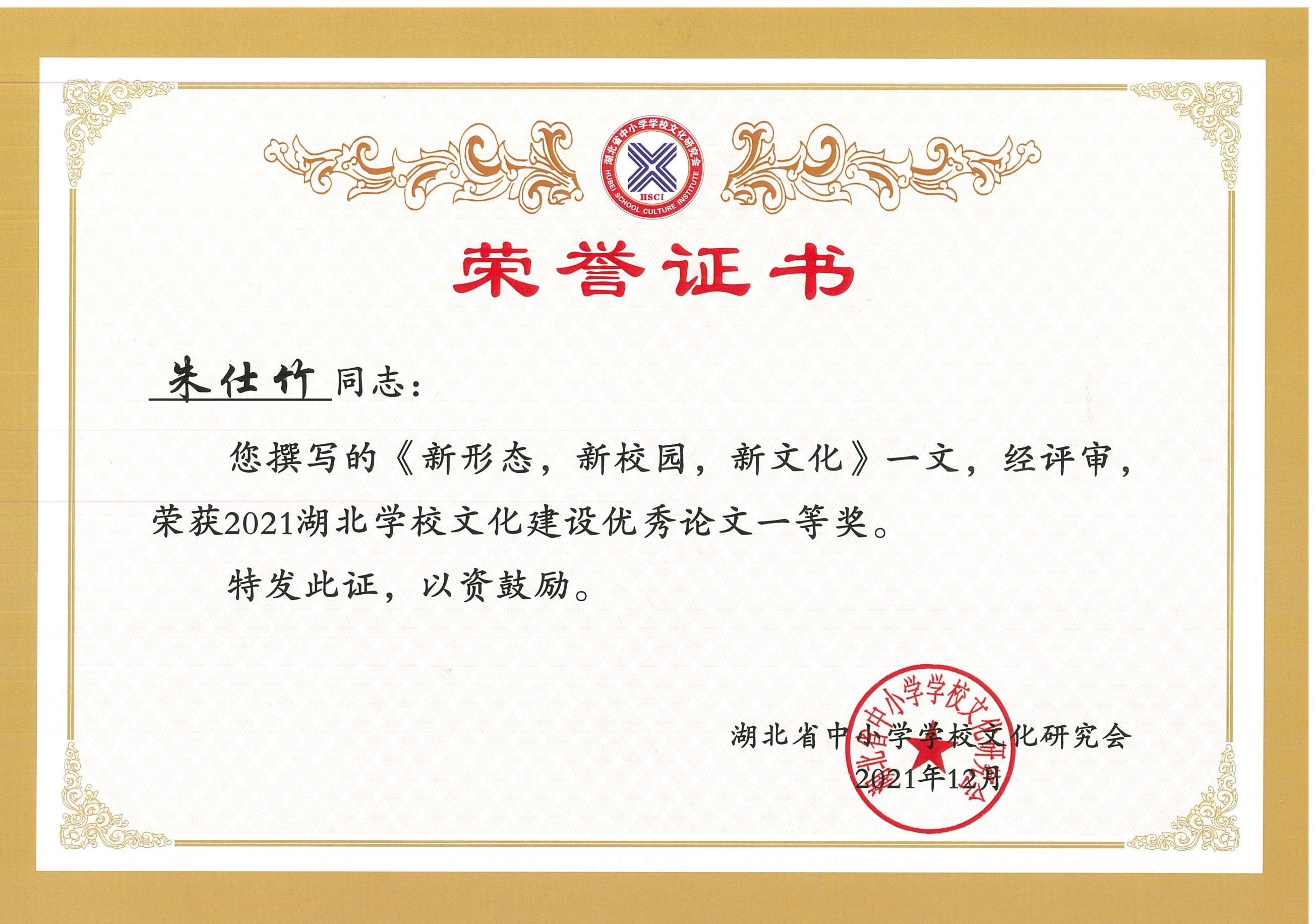 在本次论坛会上,我校荣获“2021年湖北省学校文化建设百强校”称号,校长朱仕竹荣获“湖北省学校文化建设创新奖”,其撰写的《新形态,新校园,新文化》荣获“湖北学校文化建设优秀论文一等奖”,副校长陈伟荣获“湖北省学校文化建设先进工作者”。