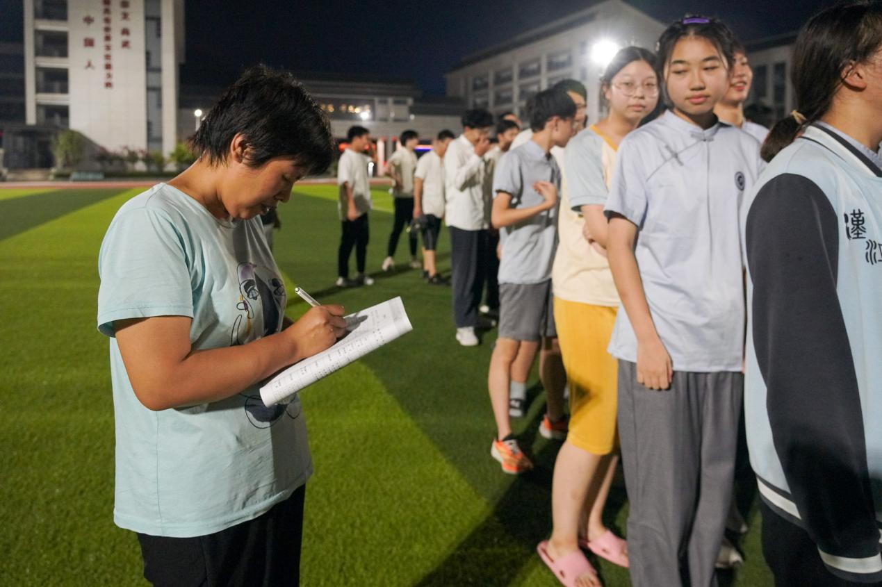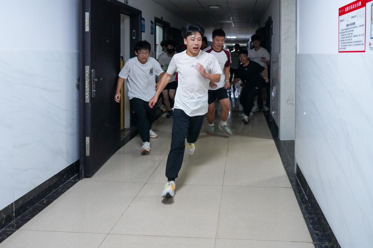 宿舍警报声响起,演练正式开始。学生们立刻从宿舍内撤离,各楼层负责安全疏导的老师迅速就位,指导学生按照预定的安全逃生路线有序疏散。在这次演练中,同学们表现出了极高的警觉性和纪律性,低姿弯腰、捂口鼻,快速向指定的安全场地移动。到达安全场地后,班主任老师立即开始点名,确保所有学生都已安全撤离。