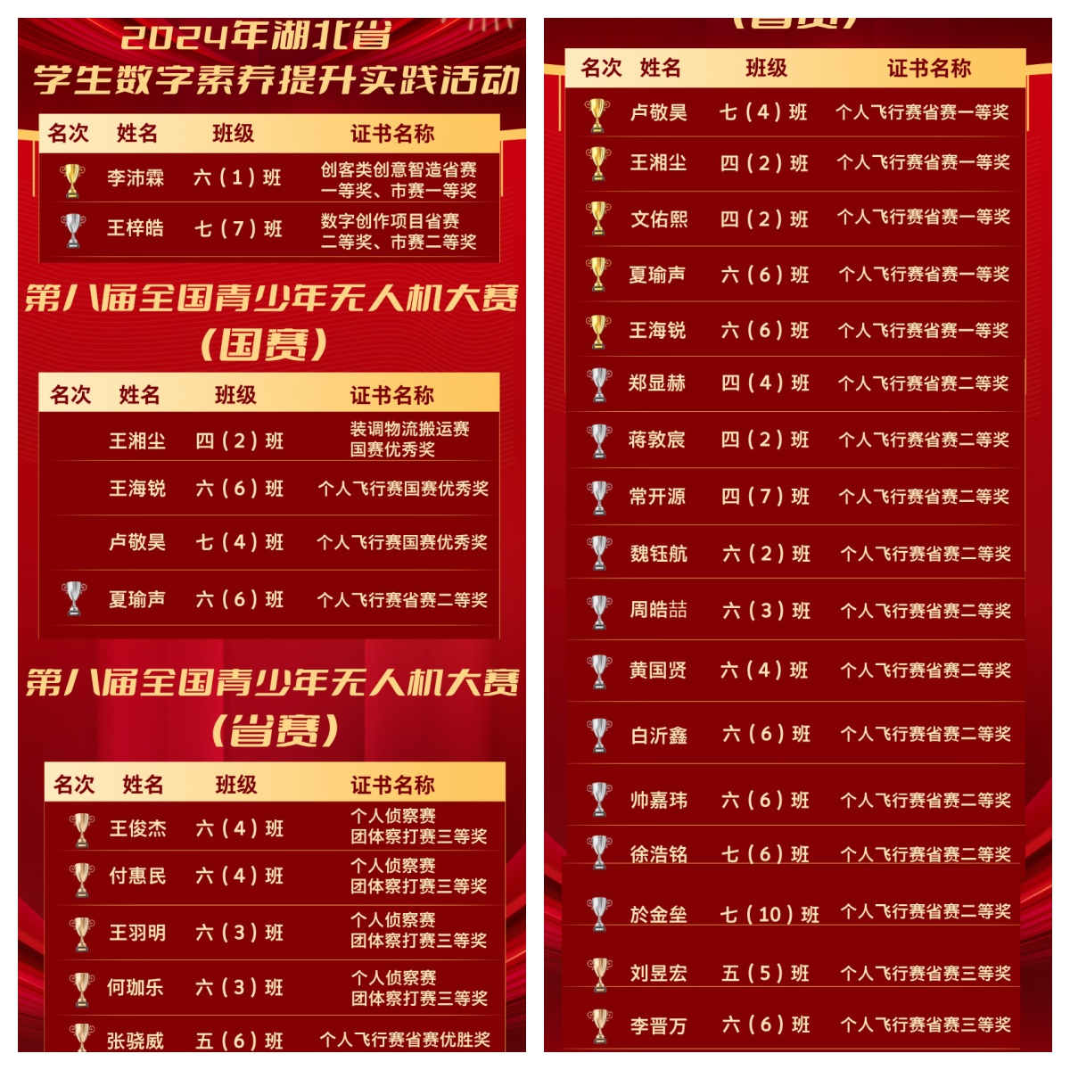 本年度,参加区级以上各类科技比赛的师生达到58人次。获得区级以上科技类集体奖项41个,其中,国家级荣誉4个, 省级荣誉 29个、市级荣誉8个。在2024年湖北省学生数字素养提升实践活动中,李沛霖同学荣获创客类创意智造省赛一等奖、市赛一等奖,王梓皓同学荣获数字创作项目省赛二等奖、市赛二等奖;王宝凤和毛平两位老师荣获“优秀指导老师奖”;严娟等6位老师在2024年湖北省教师信息素养提升实践活动中获奖。