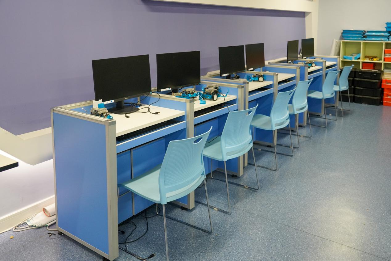 创客教室是集教学、实践、创新于一体的科技教育空间。这里配置了专用计算机、3D打印机、开源硬件、开发硬件等各型号机器人。教室划分为四大区域:教学活动区、加工创造区、竞赛pk区、作品展示区,实现了创客空间2.0,使图形化编程和代码编程方面的教学内容与人工智能时代更加契合,为学生提供了探索和实践科技创新的优质环境。在创客教室里,学生们可以自主学习、合作探究,将自己的创意和想法转化为实际的科技作品。