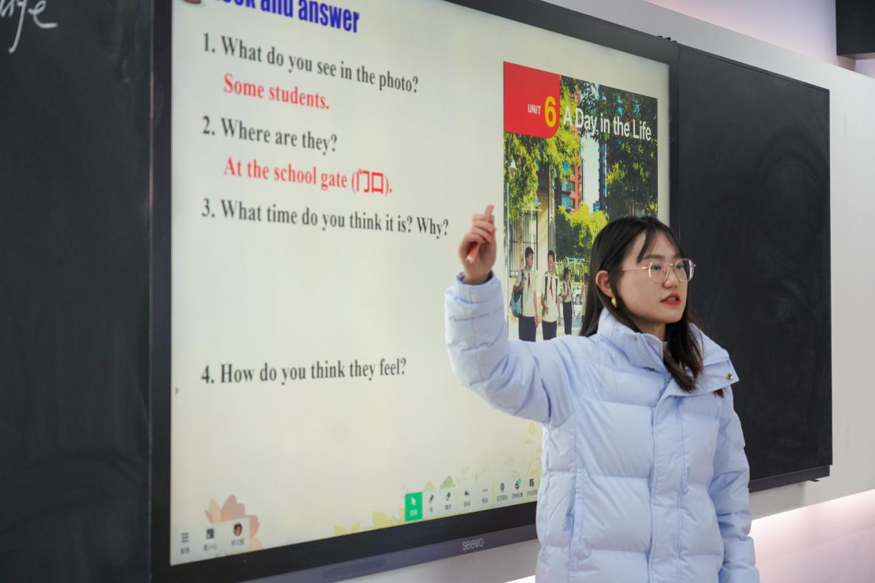 七年级英语教师李文靓主讲《Unit 6 A Day in the Life》。她精准把握新课标和新教材要求,以学生的一天为主线,设计学生生活时间轴、真实情境问题串,激发学生主动思考,积极参与。将数学学科知识与英语口语交流、书面表达相融合,通过多样的教学方法,引导学生进入英语思维的课堂环境。