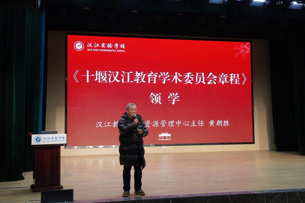 汉江教育人力资源管理中心主任黄朝胜领学《十堰汉江教育学术委员会章程》文件内容,进一步完善和保障学术委员会在学术事务中充分发挥作用,提升教师队伍专业成长。