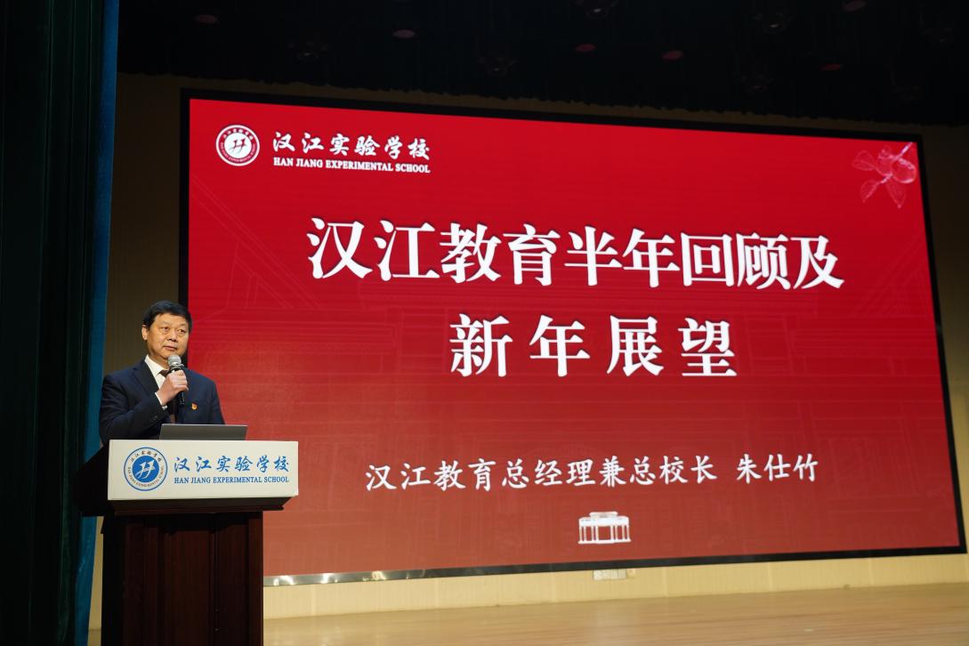 汉江教育总经理兼总校长朱仕竹全面梳理总结2024年度学校各项工作的成果与经验,科学谋划汉江教育2025年工作规划。朱校长寄语老师们要继续秉承“每个孩子都是我的唯一”的教育情怀,初心如磐、坚毅前行,准确把握办学使命,及时回应师生和家长的期待,以更加积极主动、更加理性清醒的姿态,更有力度、更有成效的作为奋战新的一年,全面提高学校的核心竞争力,奋力书写汉江教育高质量发展的新篇章。