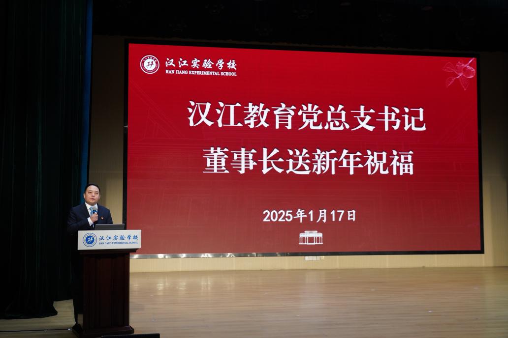 汉江教育党总支书记、董事长陈伟送新年祝福,他向一年来兢兢业业、辛勤工作、无私奉献的全体教职工致以最衷心的感谢和最美好的祝福,并总结了学校2024年在党建、家校共育、教学质量、学生发展方面取得的不凡成就,希望全体教职工以党的二十大精神为指引,统一思想、凝聚共识、坚定信心、勇毅前行、携手并进,以梦想为帆、以奋斗为桨,共同驶向教育的广阔天地,推动育人事业行稳致远。