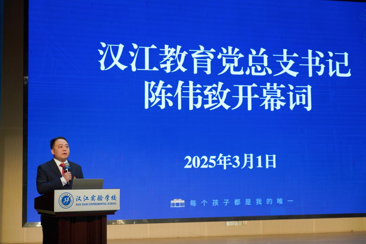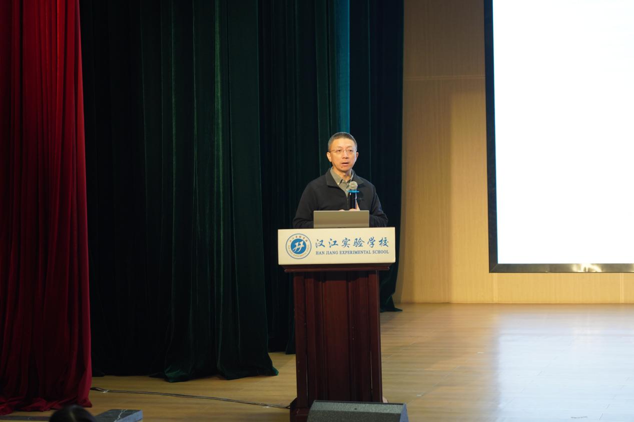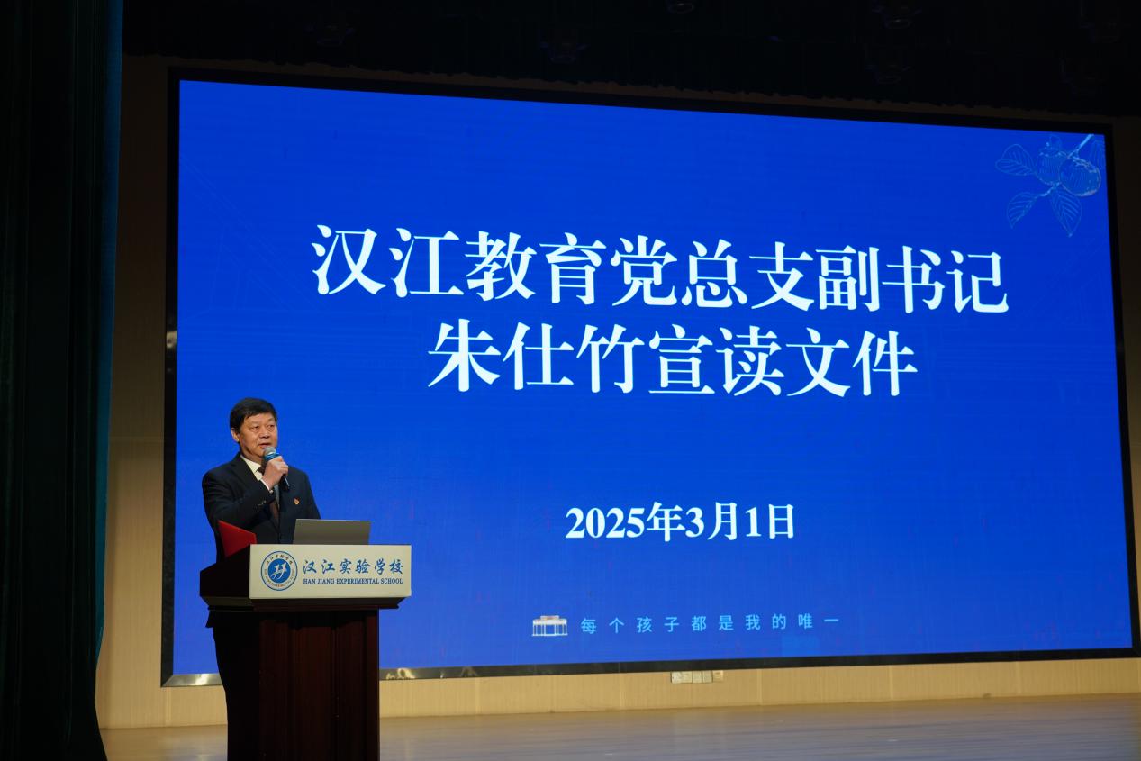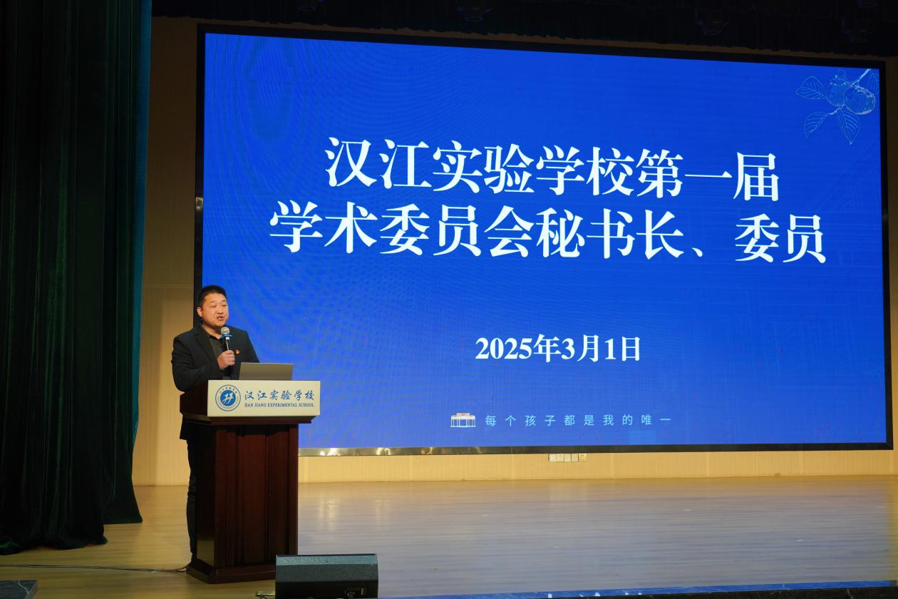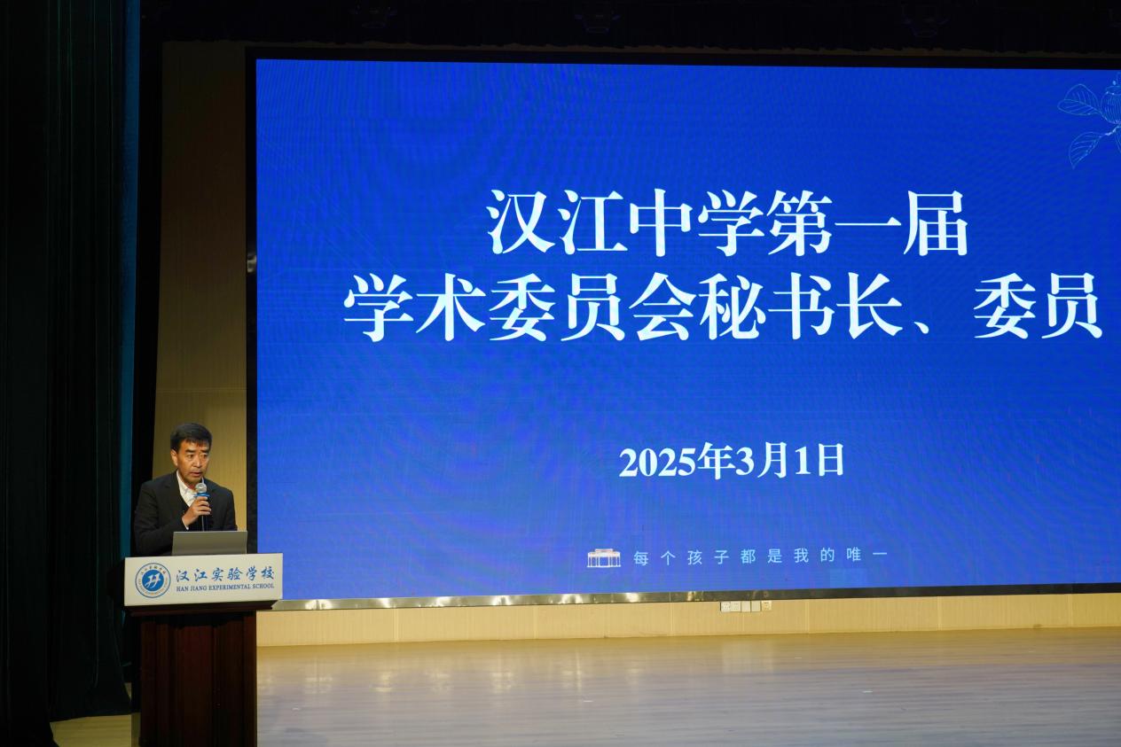 汉江教育党总支副书记朱仕竹宣读《关于成立汉江中学、汉江实验学校学术委员会的决定》,并表示汉江教育学术委员会将带领全体教师勤学笃行、启智润心、因材施教、乐教爱生,积极践行教育家精神。