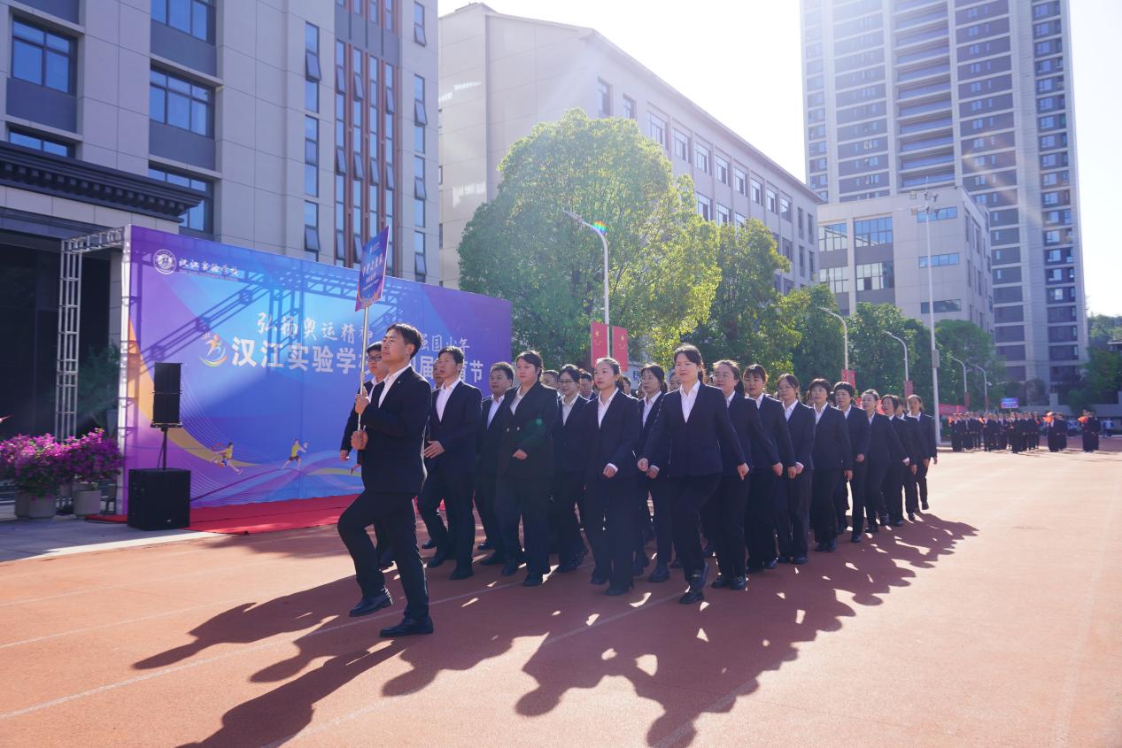 教职工方阵压轴出场,他们由中小学教师、生活教师、行政后勤、裁判员组成,昂首挺胸、意气风发,步伐坚定而整齐,每一步都踏出了汉实人对体育精神的执着追求与崇高敬意。