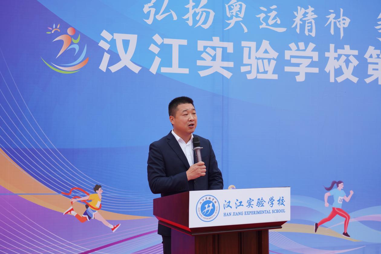 汉江实验学校校长陈磊发表致辞,他向本届体育节的召开表示热烈祝贺,向精心筹备体育节的所有教职工表示诚挚感谢。陈校长详细介绍了本次体育节的特点,并鼓励同学们在体育节活动中学会拼搏与坚持、合作与尊重,为班级争得荣誉、为学校增光添彩,勇敢创造属于自己的精彩时刻。
