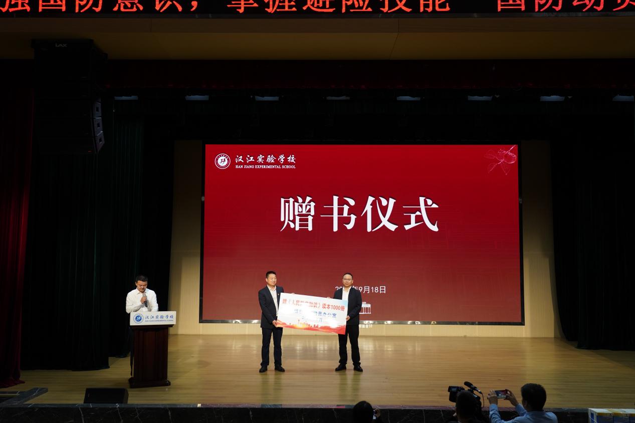 市国动办党组成员、副主任樊勋与汉江实验学校党支部书记、校长陈磊举行人防知识教材赠书仪式。