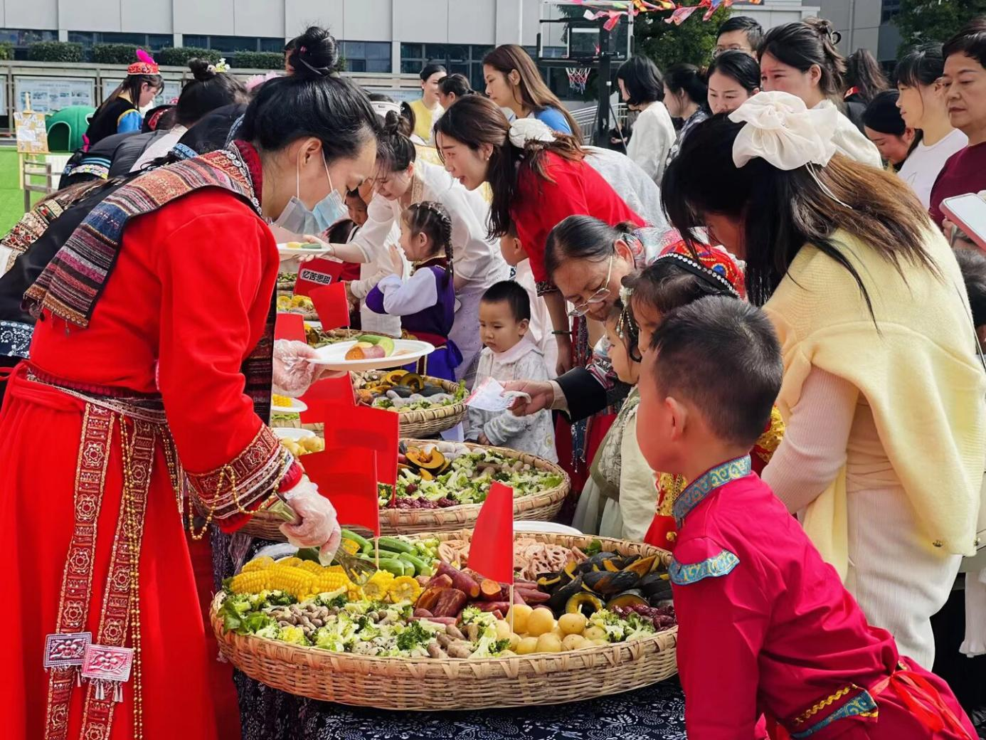 亲子游园会气氛热烈,成为孩子们最期待的环节。场上设置了“藏族押加”“黎族竹竿舞”“蒙古族顶碗”等八个特色民族游戏区。家长与孩子们携手挑战,在欢声笑语中体验了多样的民族文化,并通过集章卡凝聚了亲子合力。
